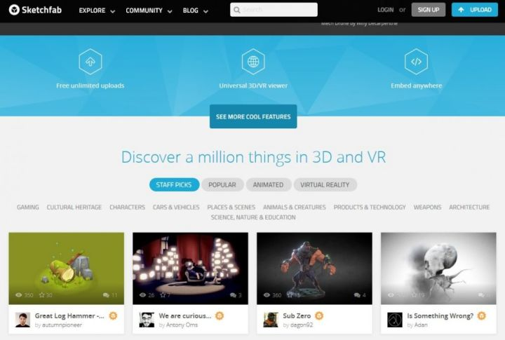 Sketchfab這個3D模型下載網站最主要有一些3D卡通人物及雕塑,每個模型都可以讓你360度旋轉欣賞。網站內的3D模型相信多達一百萬個,有些是可以3D打印出來,而有些可能只適合用作製作3D電腦動畫。有時間可以進去逛逛,裡面有很多有趣的3D模型。