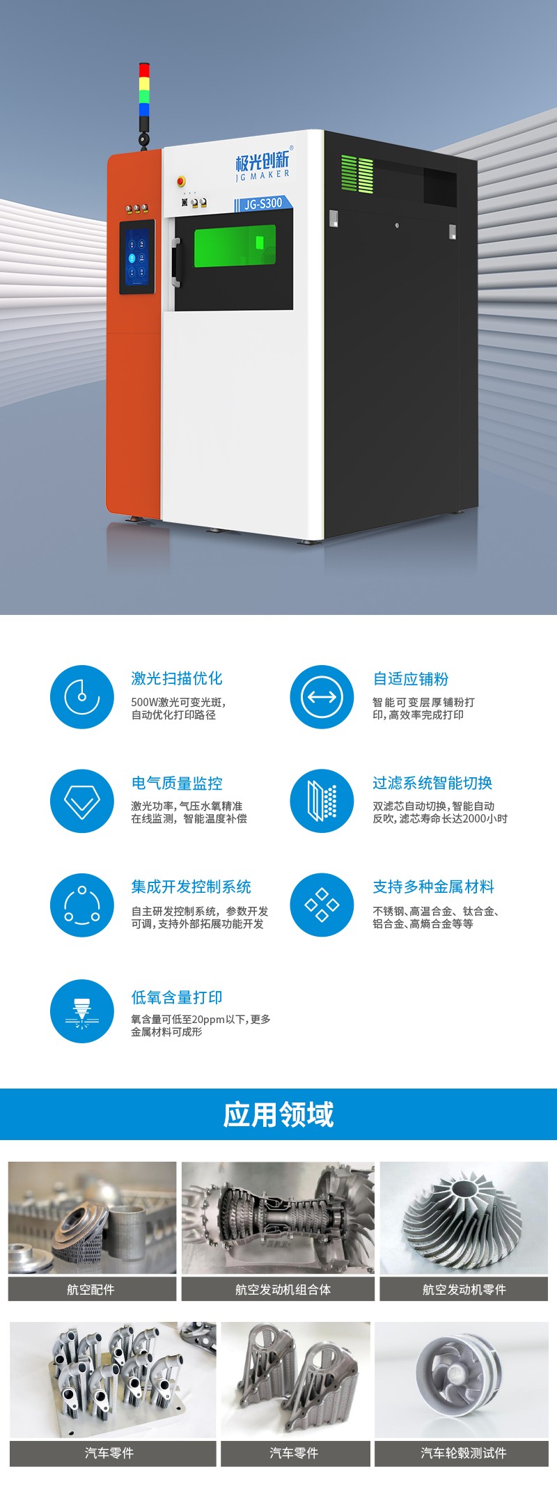 同時,作為3D打印行業的頭部企業,極光創新一直緊跟市場步伐,積極研發出更適合市場需求的3D打印產品,日前推出的全新工業級金屬3D打印設備JG-S300,可以全方位滿足工業市場各領域用戶的需求,助力企業加快市場研發效率、降本增效的同時,不斷提升市場的占有率。