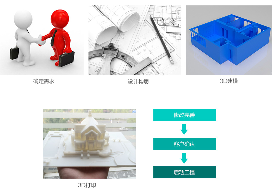 了解客戶需求→構(gòu)思設(shè)計→3D建模→3D打印出來→修改完善→客戶確認→啟動工程。